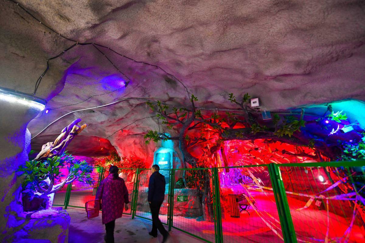 而在矿洞的另一侧,一条五光十色的“时空隧道”迎接着全国游客前来探幽访胜。融合神话叙事,尧治河村打造出国内首家矿洞人文景点——三界洞天神话主题景区,年接待游客超过20万人次。