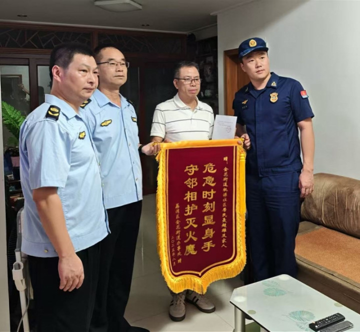 9月1日,荔湾区消防救援大队联合金花街桃园社区举行表彰仪式,并为聂超雄一家送上了感谢信和慰问金。聂超雄一家还收到了街道办赠送的锦旗,锦旗上写着“危急时刻显身手,守邻相护灭火魔”。