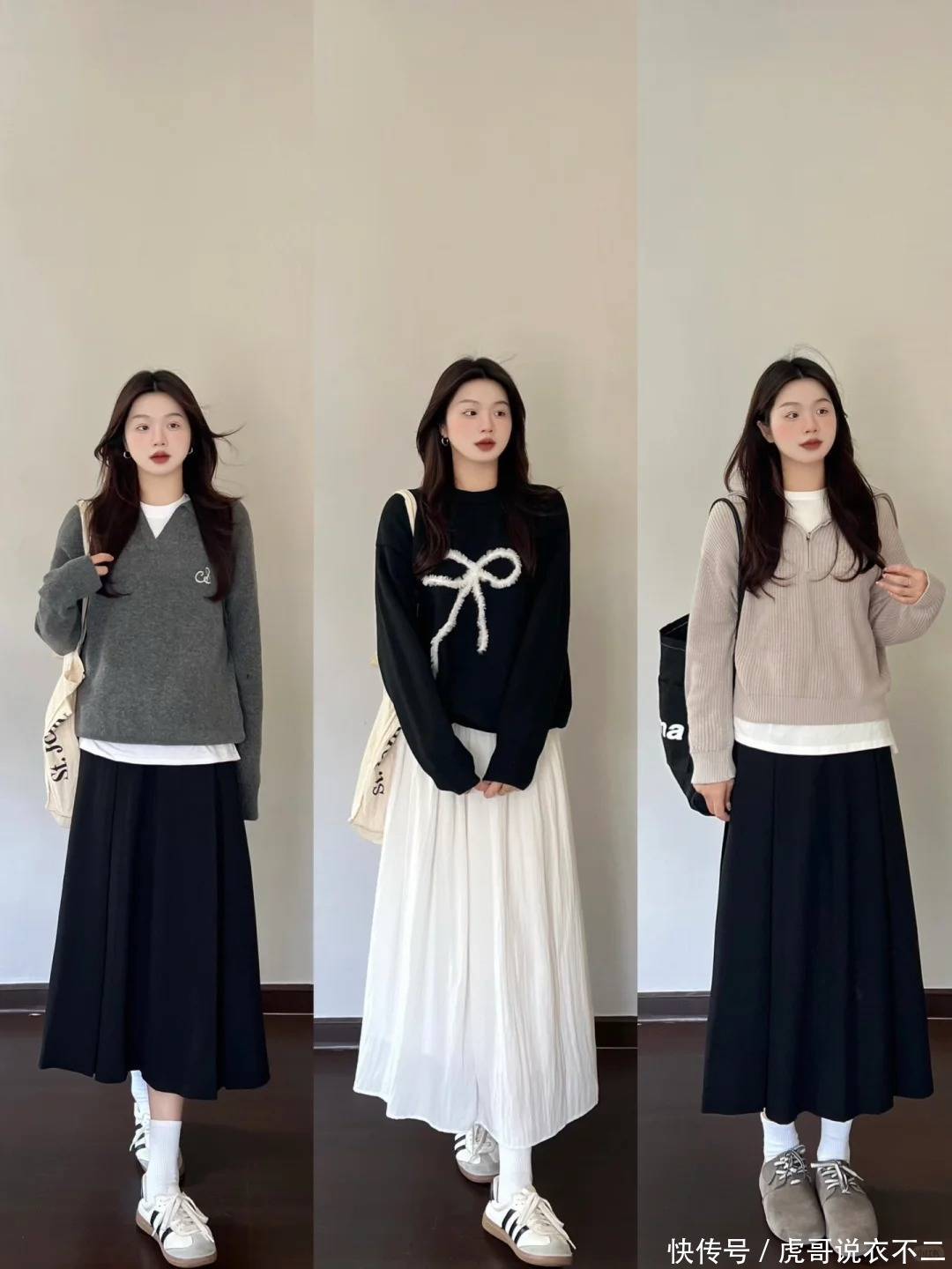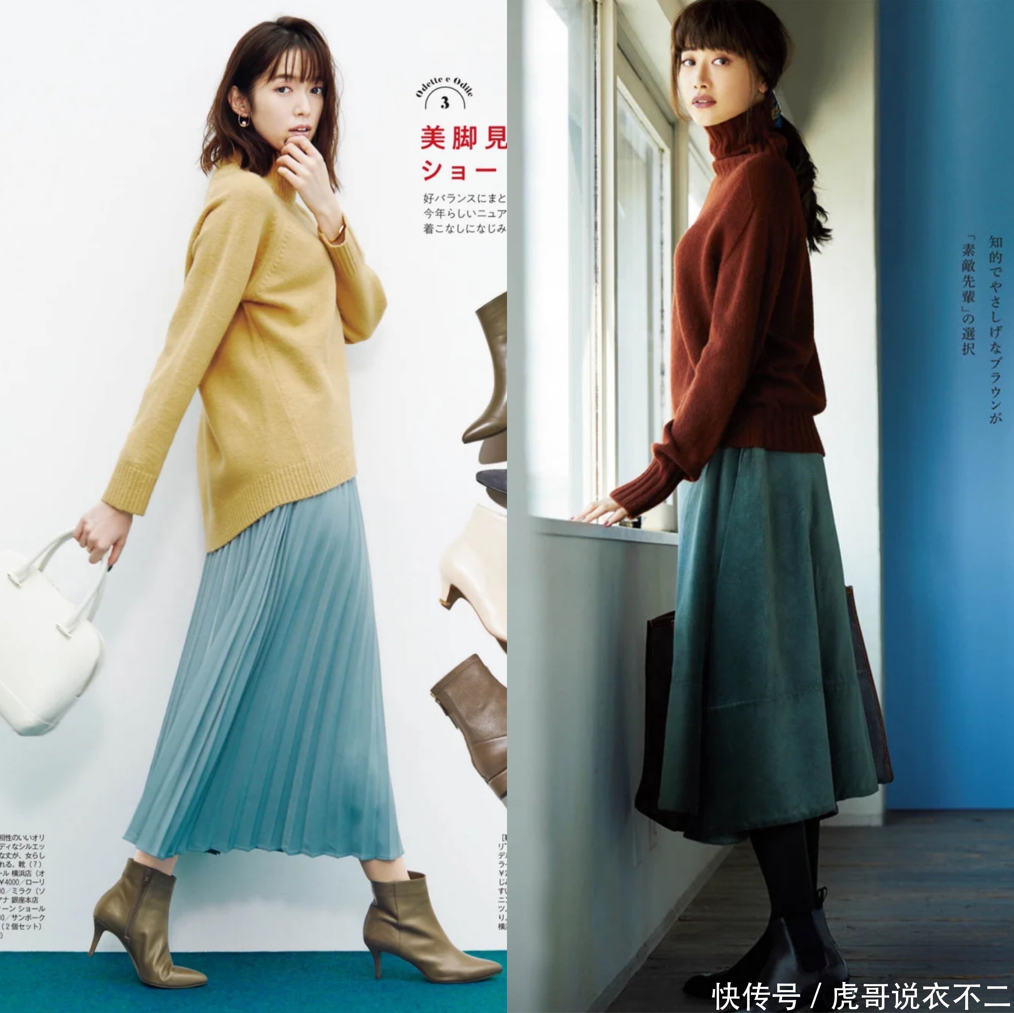 毛衣与下装的色系统一也很重要,以上图的两天穿搭为例,虽然都是彩色搭配,但非常的和谐自然,比如淡黄色毛衣+浅蓝色半身裙,暗红色+深绿色半身裙,简单总结就是,浅色+浅色、深色+深色。
