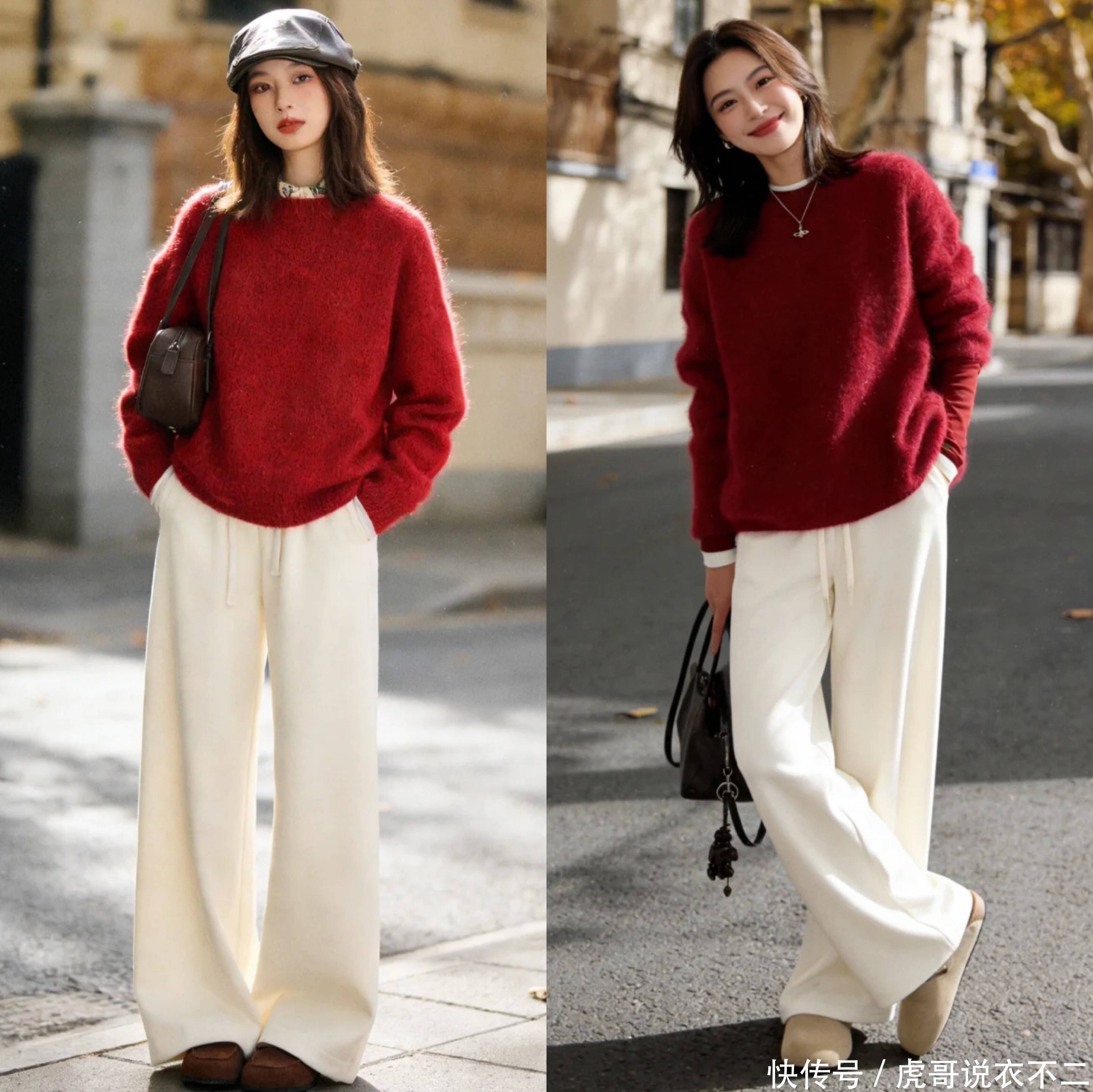 看一下穿搭实例,红色系毛衣,喜庆的暖色调,也比较适合过年的季节,搭配白色下装就显得非常的和谐不突兀,冬季穿搭选择红色毛衣作为内搭,提亮造型更衬肤色,非常的有氛围感。