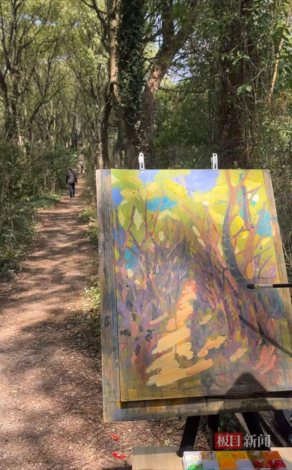 小路上,一位张姓男子正专注写生。他告诉记者,自己是江西省写生学会会员,也是刷到网上的短视频后,被这条林间小路的景致所吸引,专程前来创作。黄先生的画作色彩饱满、意境悠远,吸引了不少游客驻足观赏、拍照留念。