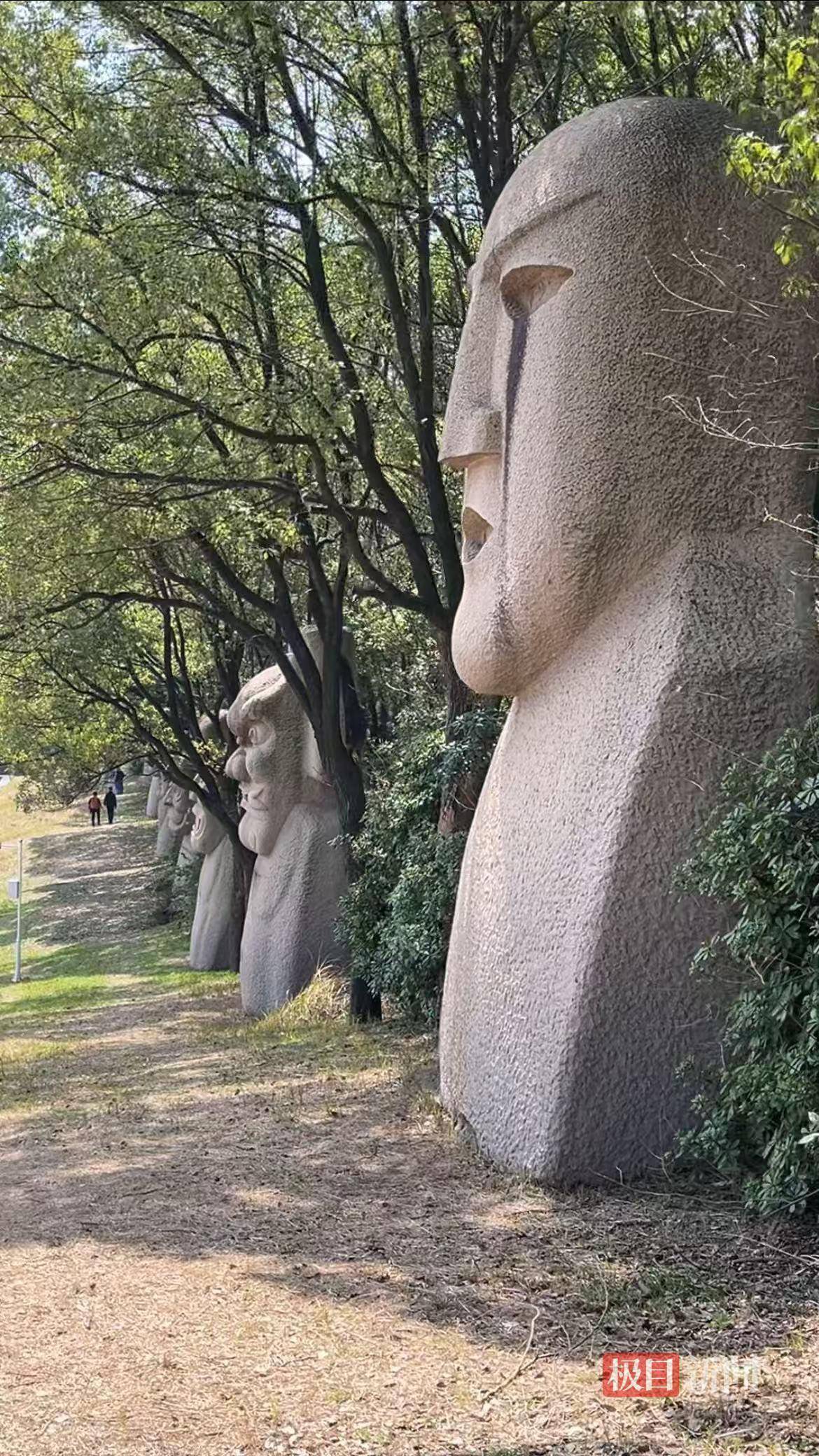 踏入园区,广场两侧的草坡上矗立着巨型石雕傩像,两侧各有10尊,气势恢宏。记者循着线索来到石像后方的林间小路,只见这里早已挤满了前来拍照游玩的游客。多名游客向记者表示,他们都是南昌本地人,通过网上的短视频了解到这个打卡点,不少人也是第一次走进傩园;还有部分游客坦言,此前曾来过傩园,但从未发现石像后方藏着这样一条静谧小径,刷到“绿野仙踪”的相关视频后,特意专程前来探访。